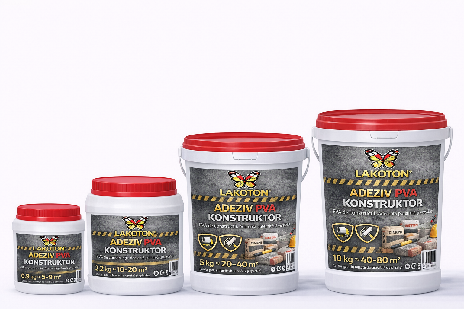 Adeziv PVA KONSTRUKTOR Lakoton – adeziv universal pe bază de PVA pentru lucrări de construcții și bricolaj. Oferă aderență puternică, este ușor de aplicat și devine transparent după uscare. Potrivit pentru amestecuri de ciment și beton, lipirea plăcilor de gips-carton, tapet, lemn și alte materiale. Disponibil în ambalaje 0,9 kg, 2,2 kg, 5 kg și 10 kg.