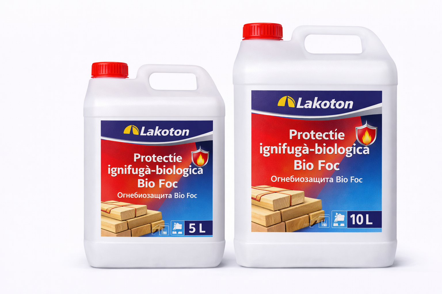 Lakoton Bio Foc — soluție pentru protecție ignifugă și biologică a lemnului. Protejează materialele din lemn împotriva focului, mucegaiului, ciupercilor și insectelor. Potrivit pentru utilizare la construcții din lemn, acoperișuri, grinzi și alte elemente structurale. Disponibil în canistre de 5 L și 10 L.
