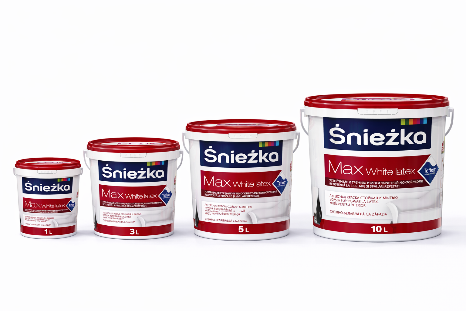 Śnieżka Max White Latex– vopsea latex superlavabilă pentru interior, destinată pereților și tavanelor. Creează un strat rezistent la frecare și spălări repetate, oferind un alb intens și durabil. Datorită tehnologiei Teflon™ Surface Protector, suprafața este mai rezistentă la murdărie și ușor de curățat. Ideală pentru locuințe, birouri și spații cu trafic ridicat. Disponibilă în ambalaje 1 L, 3 L, 5 L și 10 L.