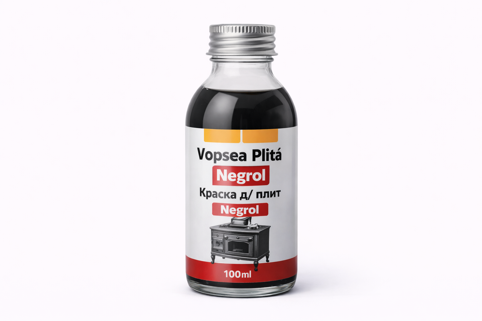 Vopsea Plită Negrol — vopsea specială pentru curățarea și reîmprospătarea plitelor, sobelor și suprafețelor metalice expuse la temperaturi ridicate. Redă culoarea neagră intensă și oferă protecție împotriva uzurii. Ambalaj 100 ml în sticlă.